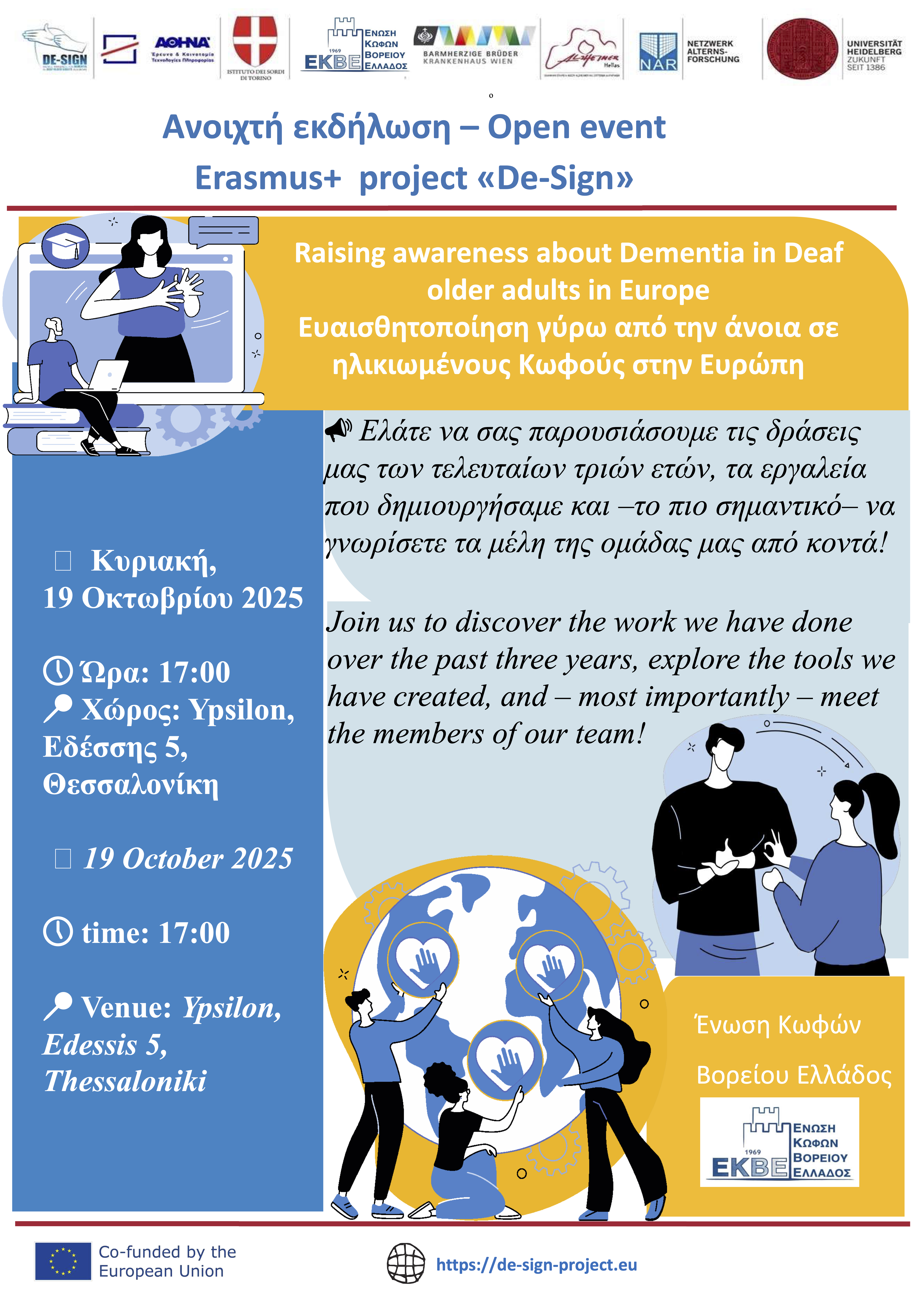 Raising awareness about dementia in Austrian, German, Greek and Italian Deaf communities: the De-Sign Erasmus+ project. Abstract sent to be presented at the Alzheimer’s Europe Conference 8-10/10/2024, Geneva, Switcherland.